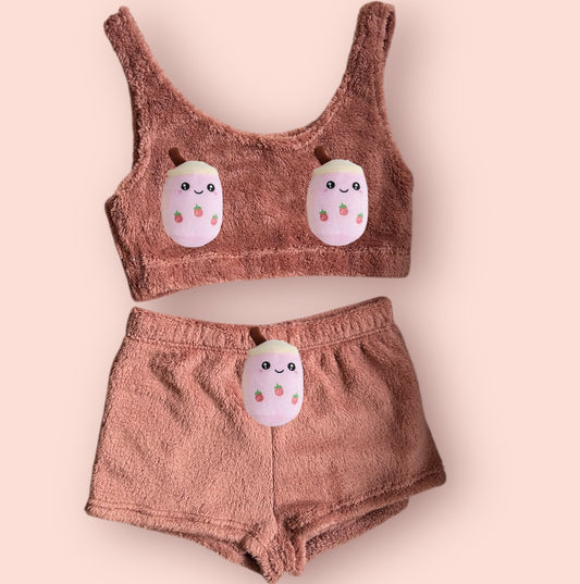 Rose Pink Boba Tea Fluffy Loungewear Set